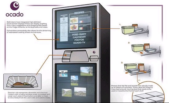中兰开夏大学和网络超市Ocado研究人员正在联合研发智能冰箱。按照研究人员的设想,冰箱上下两个门具有超声波扫描功能,能够扫描储物架上食材,了解库存,据此推荐食谱,向超市订购食品。