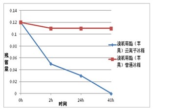 通过检测,我们可以看到,云离子冰箱内2小时农药降解率为63.06%,24小时的降解率为75%。48小时降解率>99.9。降解农药效果显著。而普通冰箱没有降解农药效果。
