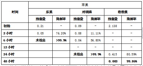 同时,我们也把表面有乐果、对硫磷和敌敌畏等常见农药的苹果也放进康佳云离子冰箱,通过长时间的持续观察检测,得出以下数据: