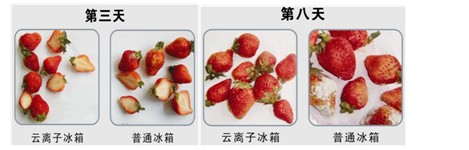 实验证明:普通冰箱里的草莓第3天就开始发霉,第8天发霉严重,而云离子冰箱第8天天都没有任何发霉的情况。放在云离子冰箱的草莓第8天的保鲜状态,相当于普通冰箱的第3天的保鲜状态。